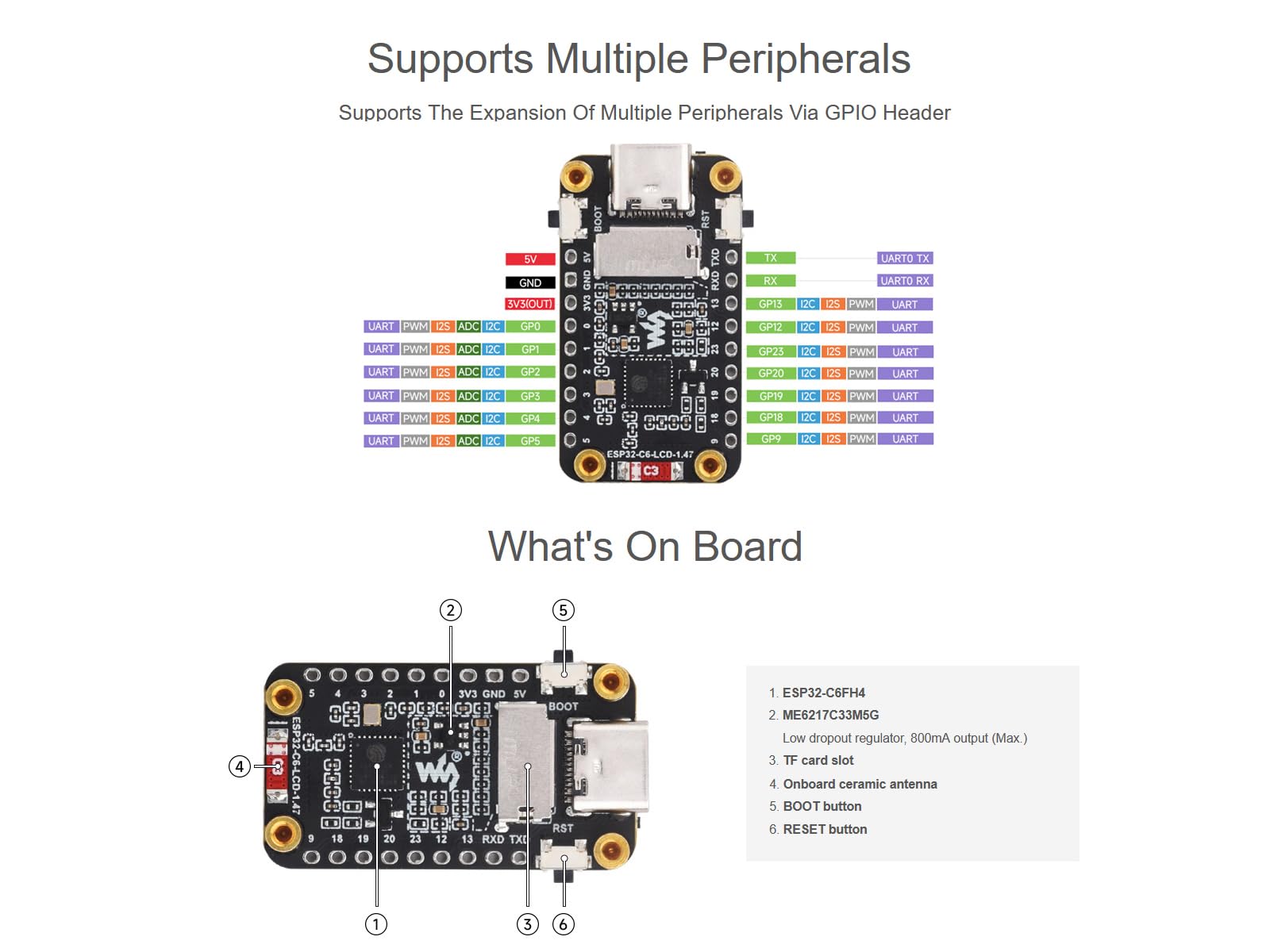 GPIO: Выведенные пины (SPI, I²C, UART, ADC, GPIO и др.)